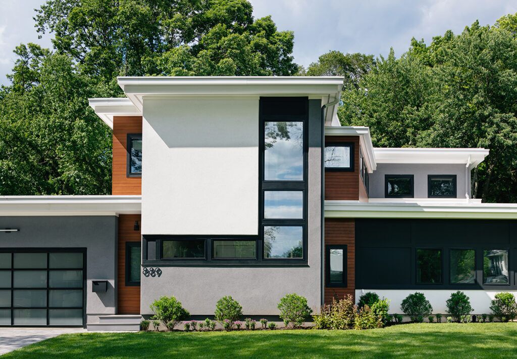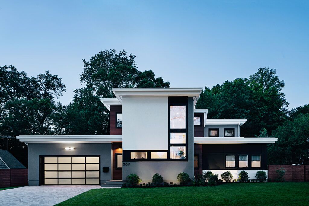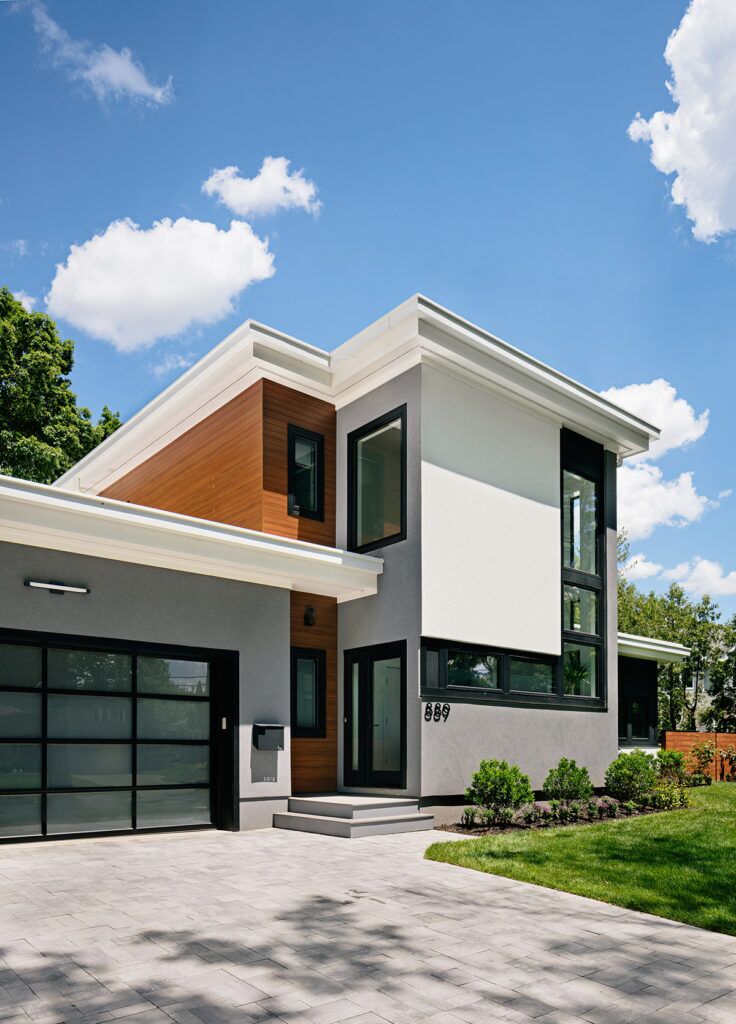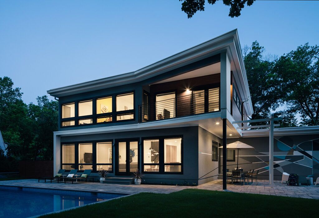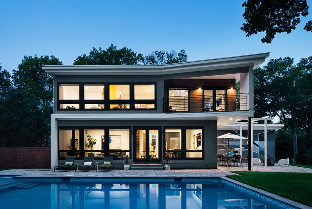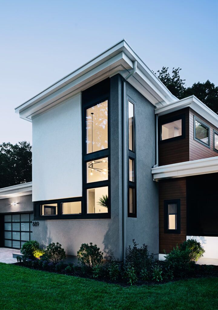 New residence in place of original Colonial dwelling. The front façade maintains the scale and proportion of adjacent homes in a Colonial and Tudor-inspired neighborhood, while the forms and materials reinforce the West Coast aesthetic that was important for the family to keep when they relocated. The exterior design is seamlessly integrated with the interior aesthetic and the private rear yard and pool.