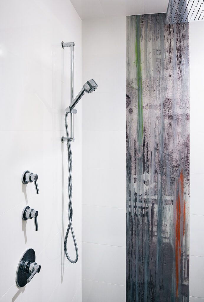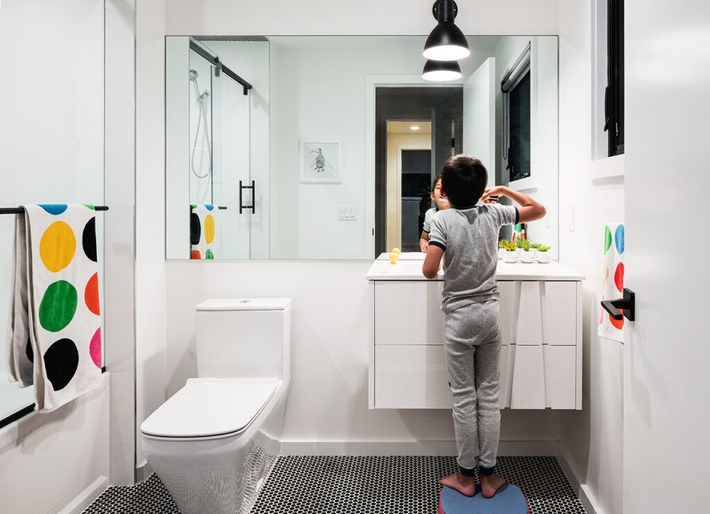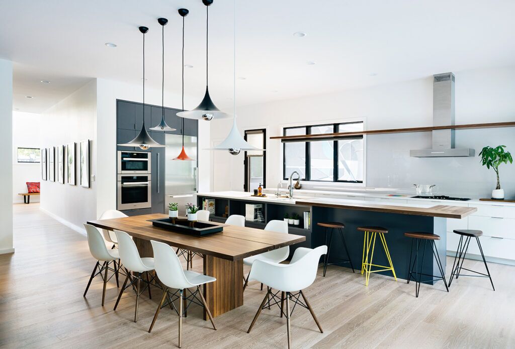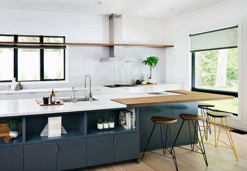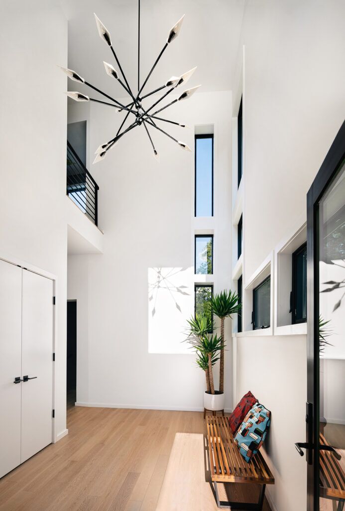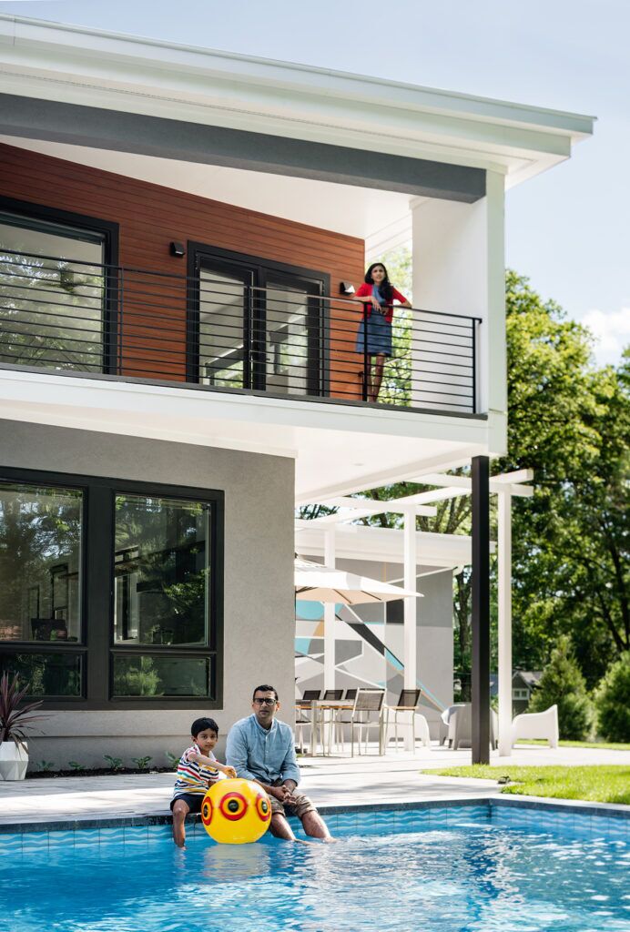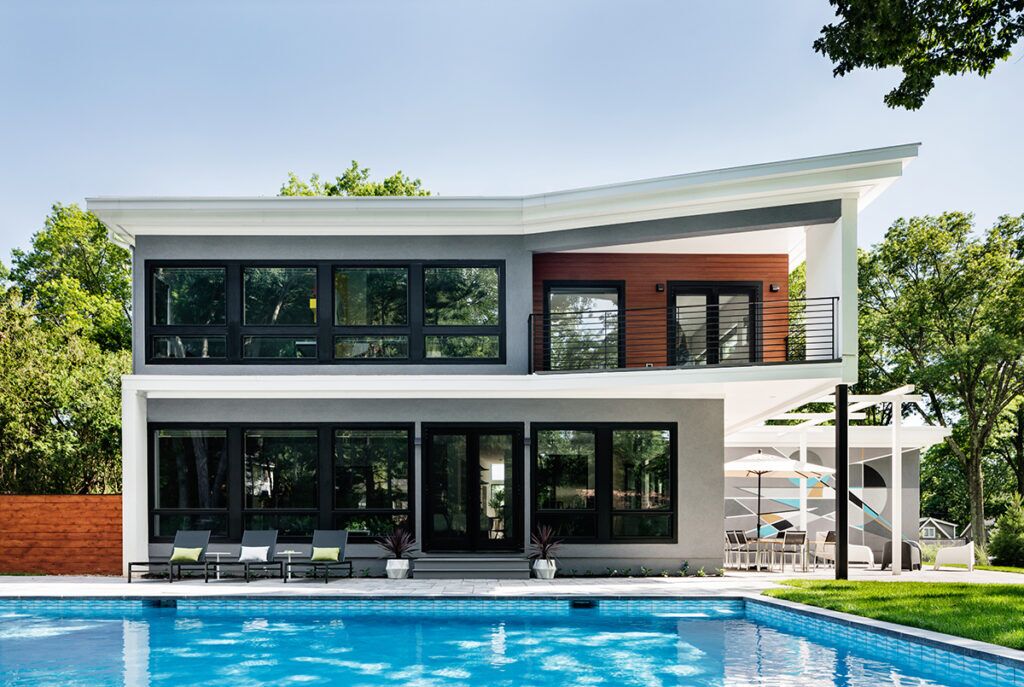 New residence in place of original Colonial dwelling. The front façade maintains the scale and proportion of adjacent homes in a Colonial and Tudor-inspired neighborhood, while the forms and materials reinforce the West Coast aesthetic that was important for the family to keep when they relocated. The exterior design is seamlessly integrated with the interior aesthetic and the private rear yard and pool.