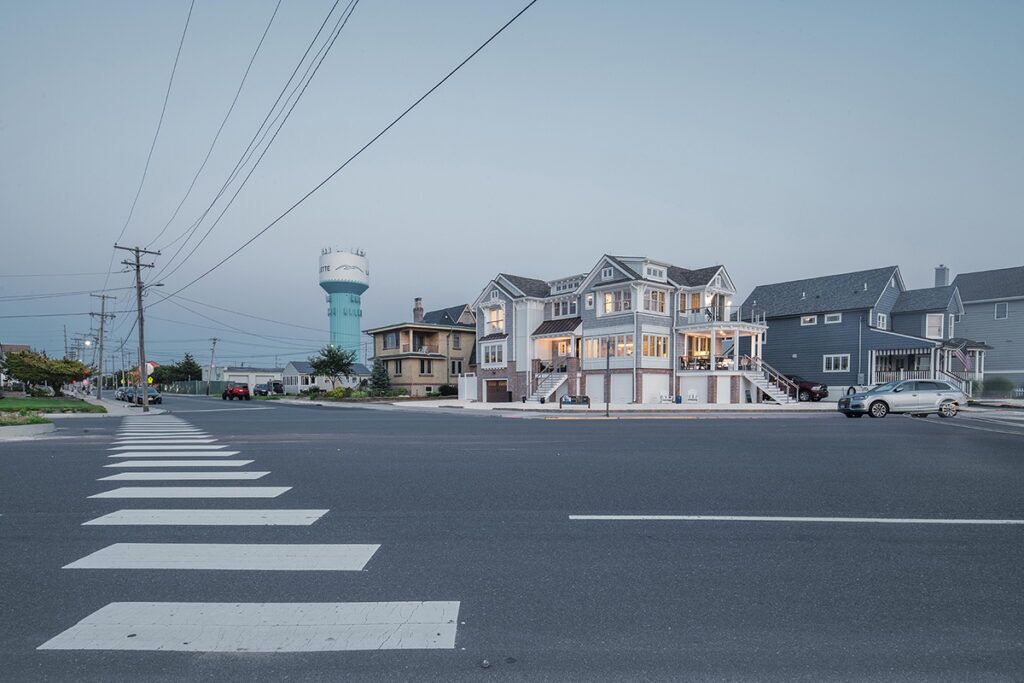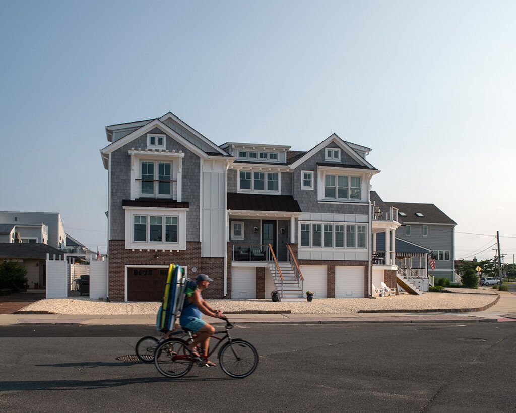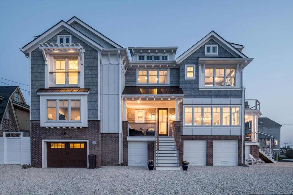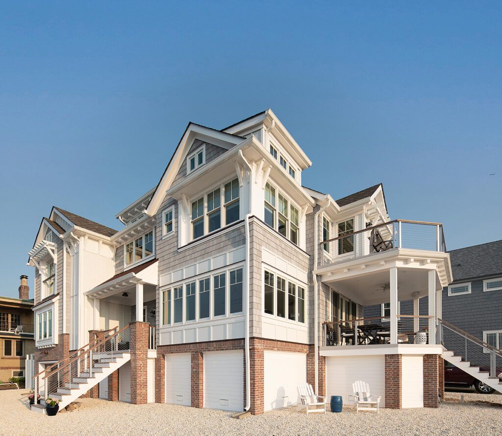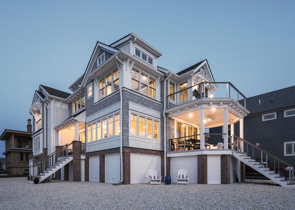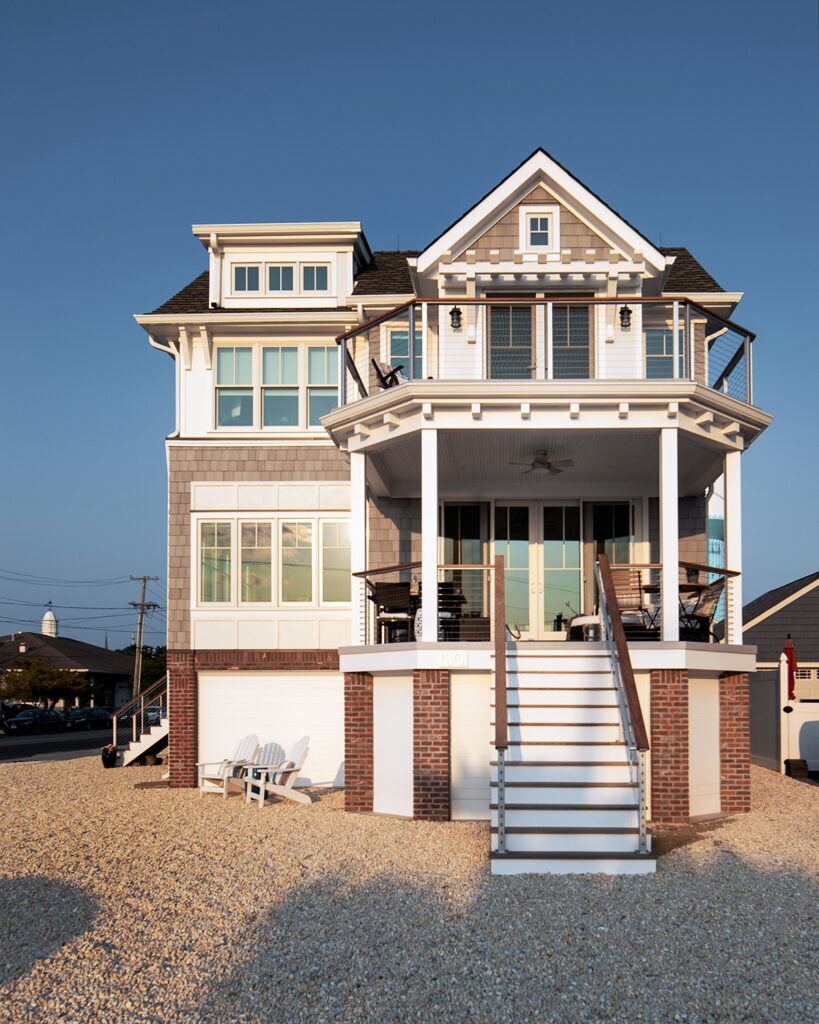 New residence in place of original dwelling. The main living spaces were raised and reinforced to conform to the latest flood zone codes and safety requirements while retaining a cozy and relaxing atmosphere to unwind in. The layout took advantage of a prime corner lot location to maximize views of the bay and sunset. The composite shake and trim materials reduce maintenance and maintain the classic shore architectural detail and appeal.